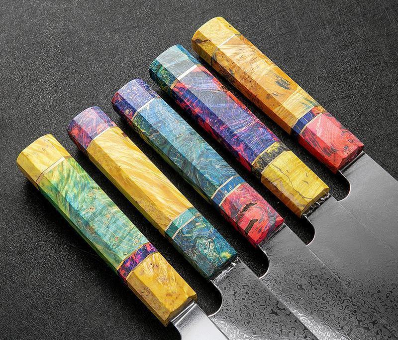 Cada alça dessas lindas facas é única por suas cores e padrões. Eles são feitos de madeira solidificada à mão e são resistentes ao calor.